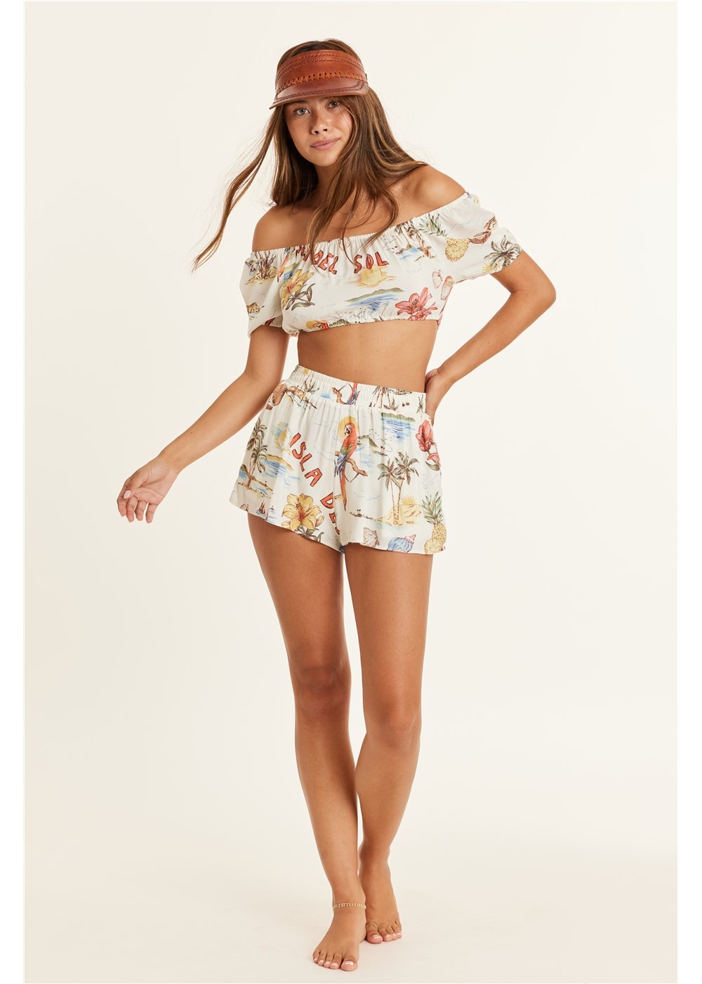 All over printed lightweight woven skirt in viscose. Short sleeve top with front button placket and a chest pocket.