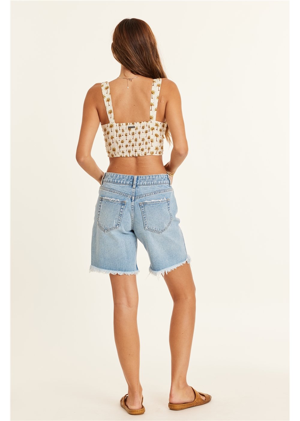 This playful top features a combination of cotton and linen fabrics with a smocked design, adjustable spaghetti straps, and a cropped cu